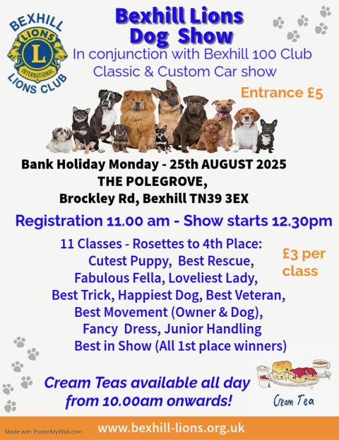 Bexhill Lions are set to welcome wagging tails and proud owners to The Polegrove, Brockley Road, Bexhill on Monday 25 August 2025 for their ever-popular Dog Show.